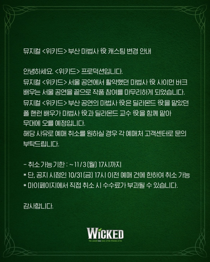 *12월 11일(목) 단체판매로 마감되었습니다.       홈페이지: https://www.wickedthemusical.co.kr/